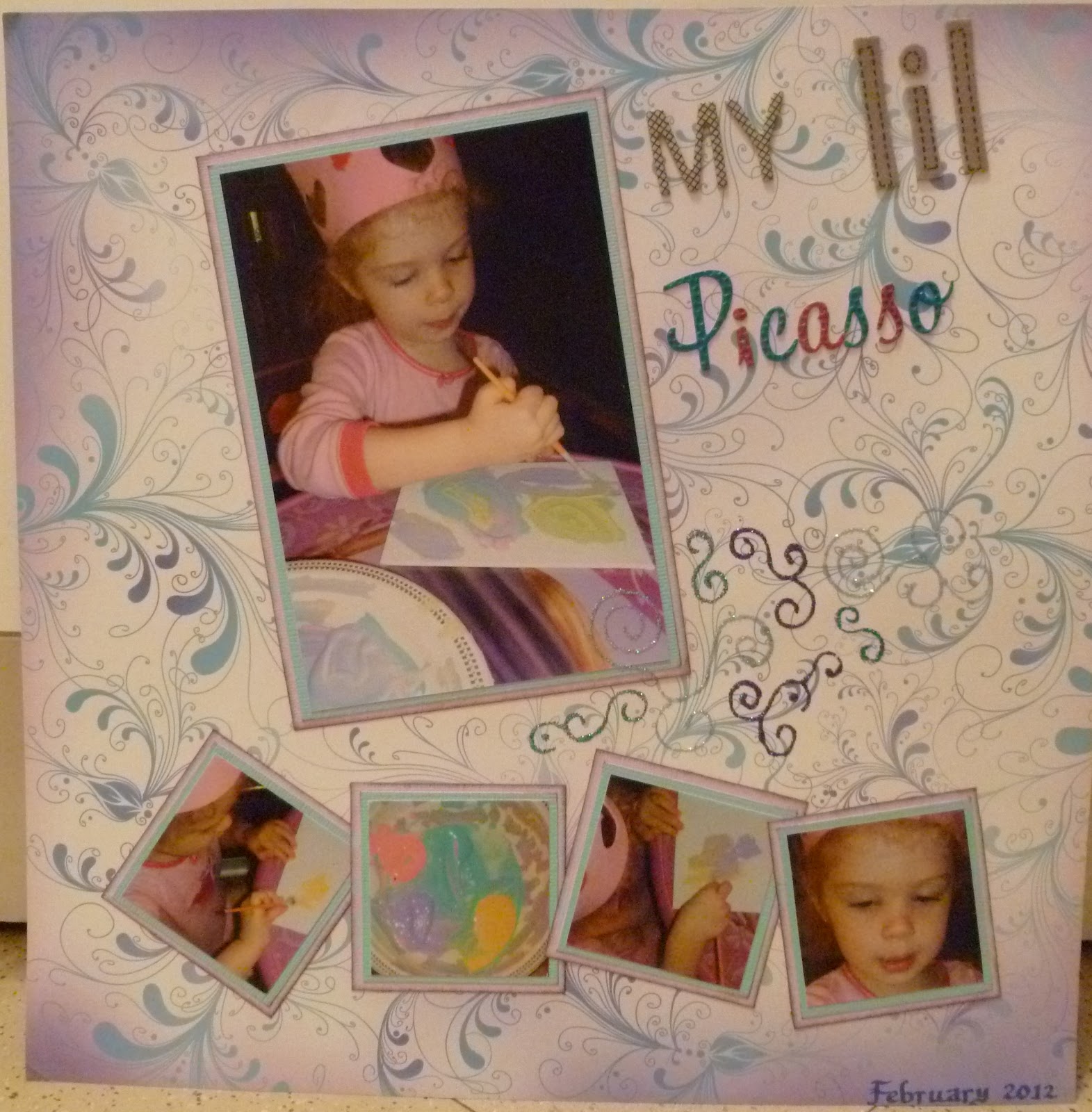 Lastly, I did sketch #4. Those are the eggs I filled for the egg hunt for my daughter, nephew and niece. The basket was the one for my daughter (my nephew's had Spiderman stuff in it and my niece's had board books and things more appropriate for her at 14 months). The page was done with scraps that I had and I like the mix of colors. However, I am struggling to find a clever title to add, so that is all that is missing. I hope to get hit with inspiration at a later time...